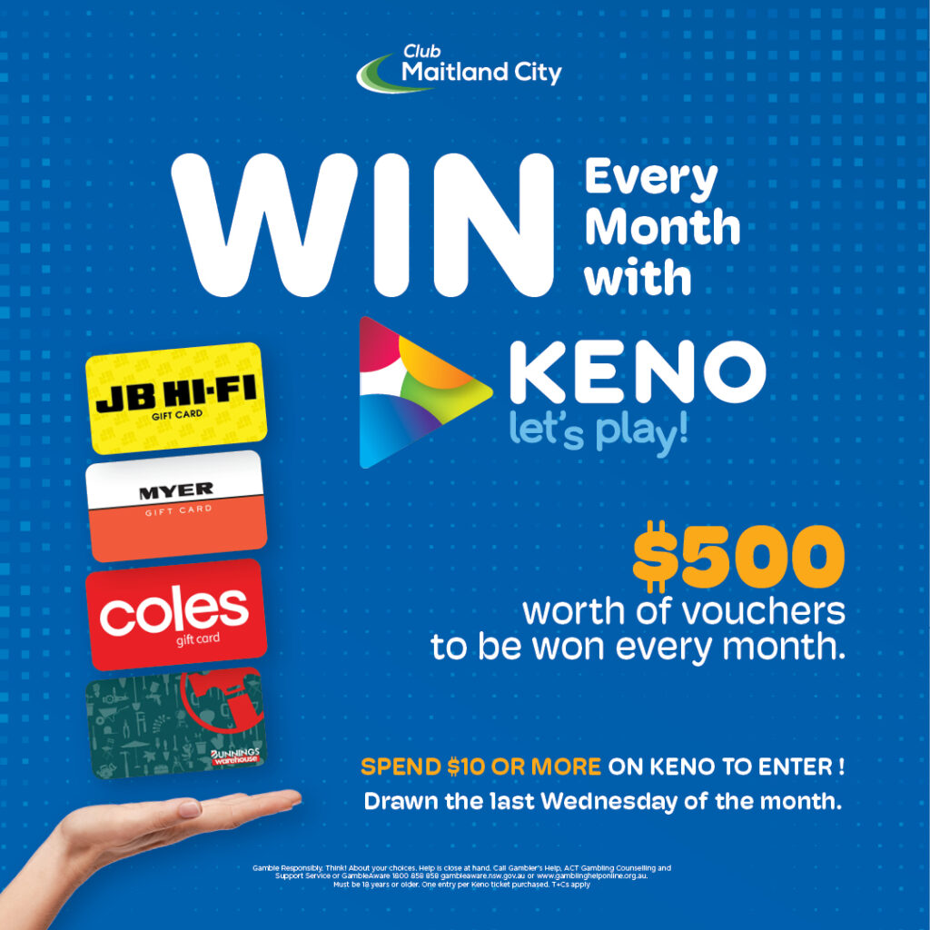 Every month you could win up to $500 worth of vouchers when you play Keno at Club Maitland City! Simply spend $10 or more on Keno and you will receive an entry into our monthly draw.